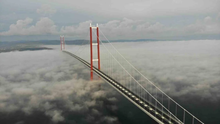 2023 metre orta açıklığıyla dünyanın en uzun orta açıklığa sahip asma köprüsü olan 1915 Çanakkale Köprüsü’nün sis bulutu altındaki hali ise drone ile görüntülendi. Sis bulutu geçişi sırasında 1915 Çanakkale Köprüsünün görüntüsüyle adeta büyüledi.