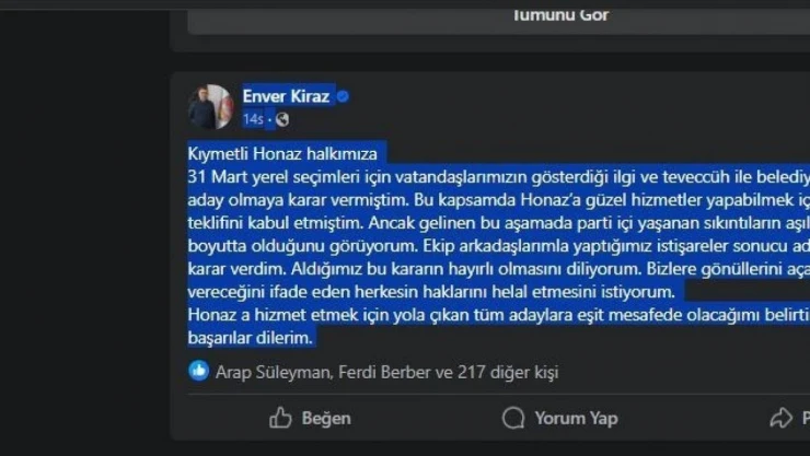 Adaylıktan geri çekilen Kiraz, sosyal medya hesabından yaptığı açıklamada, “Kıymetli Honaz halkımıza;