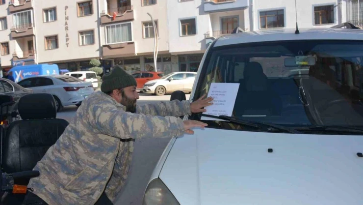 Yozgat’ın Sorgun ilçesinde engelli araçlara özel olarak ayrılan park yerlerini işgal eden sürücülerin araçlarının üzerine farkındalık oluşturmak için bir grup engelli, “Biz engelliler sizlere engel değiliz, sizler de bizlere engel olmayın” yazısı astı.