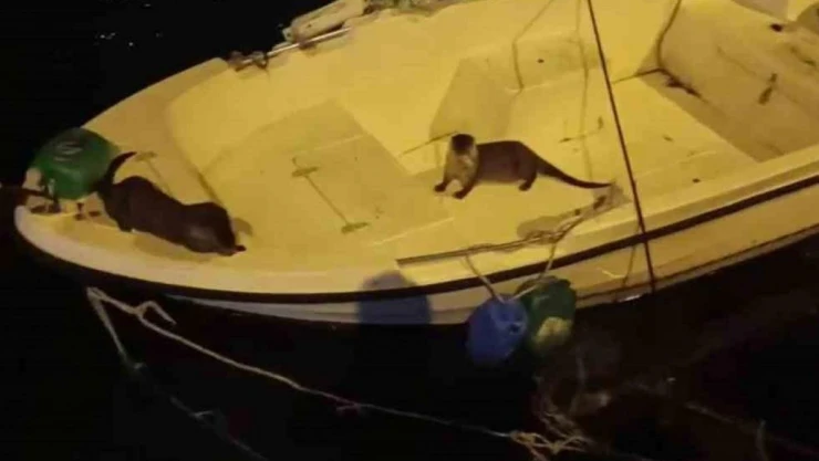 Bursa'da balık avlayan su samurları kıyıdaki teknelerde keyif yaptı. O anları gören vatandaşlar su samurlarını şaşkınlıkla izledi.