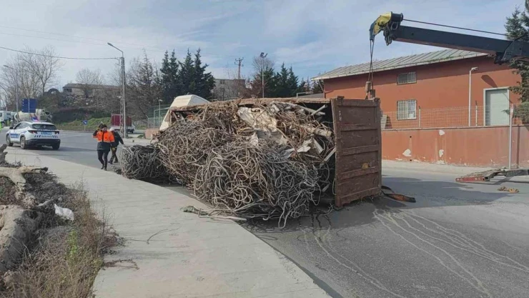 Sultangazi'de tonlarca ağırlıkta hurda demir yüklü tır, sürücünün viraja alamaması nedeniyle yan yattı. Kazada sürücü yara almadan kurtulurken, devrilen tırdaki hurda demirler yola döküldü.