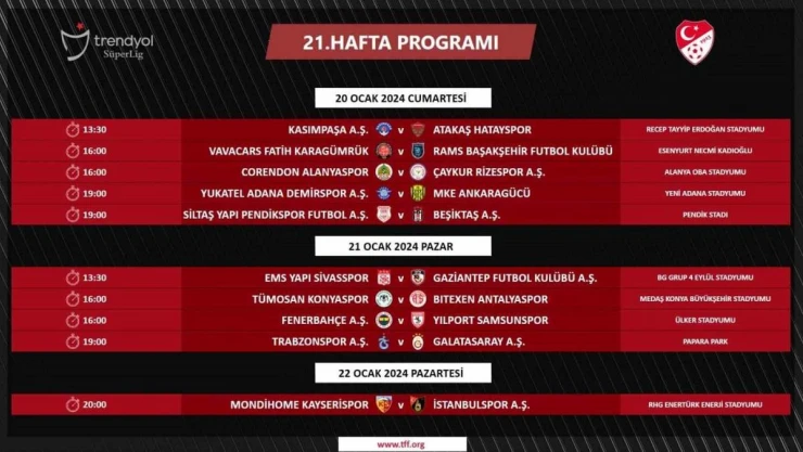 Türkiye Futbol Federasyonu, Trendyol Süper Lig’in 21, 22 ve 23. hafta müsabaka programını duyurdu. TFF resmi internet sitesinden yapılan açıklamaya göre Süper Lig’de 21, 22 ve 23. haftanın karşılaşma programları şu şekilde: