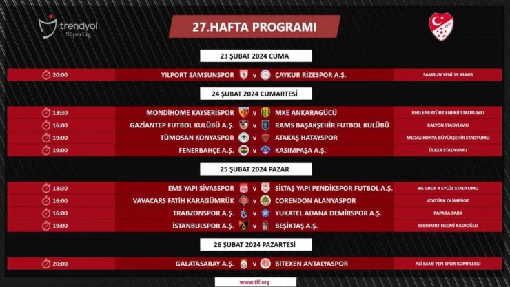 Trendyol Süper Lig’in 27, 28, 29 ve 30. haftalarında oynanacak maçların programı Türkiye Futbol Federasyonu (TFF) tarafından açıklandı. Ligin 28. haftasında Beşiktaş’ın, Galatasaray’ı ağırlayacağı mücadele 3 Mart Pazar günü saat 19.00’da yapılacak. Süper Lig’in 30. haftasında ise Trabzonspor ile Fenerbahçe 17 Mart Pazar günü saat 20.30’da karşı karşıya gelecek.