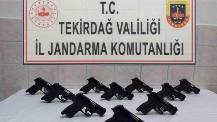 Tekirdağ'ın Çorlu ilçesinde jandarma ekiplerince durdurulan şüpheli araçtan 10 adet ruhsatsız tabanca ve uyuşturucu hap ele geçirilirken olayda 2 şüpheli tutuklandı.