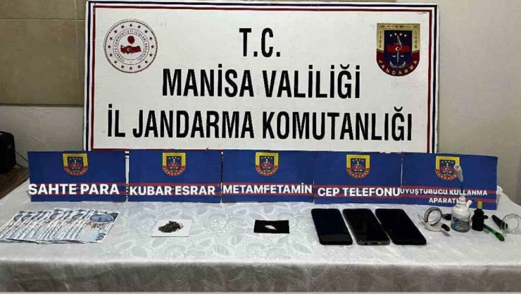 Uyuşturucu veya uyarıcı madde ticareti yapan, nakleden ve kullanan şahıslara yönelik çalışmalarını sürdüren Salihli İlçe Jandarma Komutanlığına bağlı ekipler, durumundan şüphelendikleri V.Ü. (37), S.T. (39), K.Ö. (34) ve İ.E.’yi (40) durdurup arama yaptı. Şüphelinin yapılan üst aramasında 2 gram metamfetamin, 4 gram kubar esrar, 3 bin 500 lira sahte para, 5 adet uyuşturucu kullanma aparatı bong ve 3 adet cep telefonu ele geçirildi.