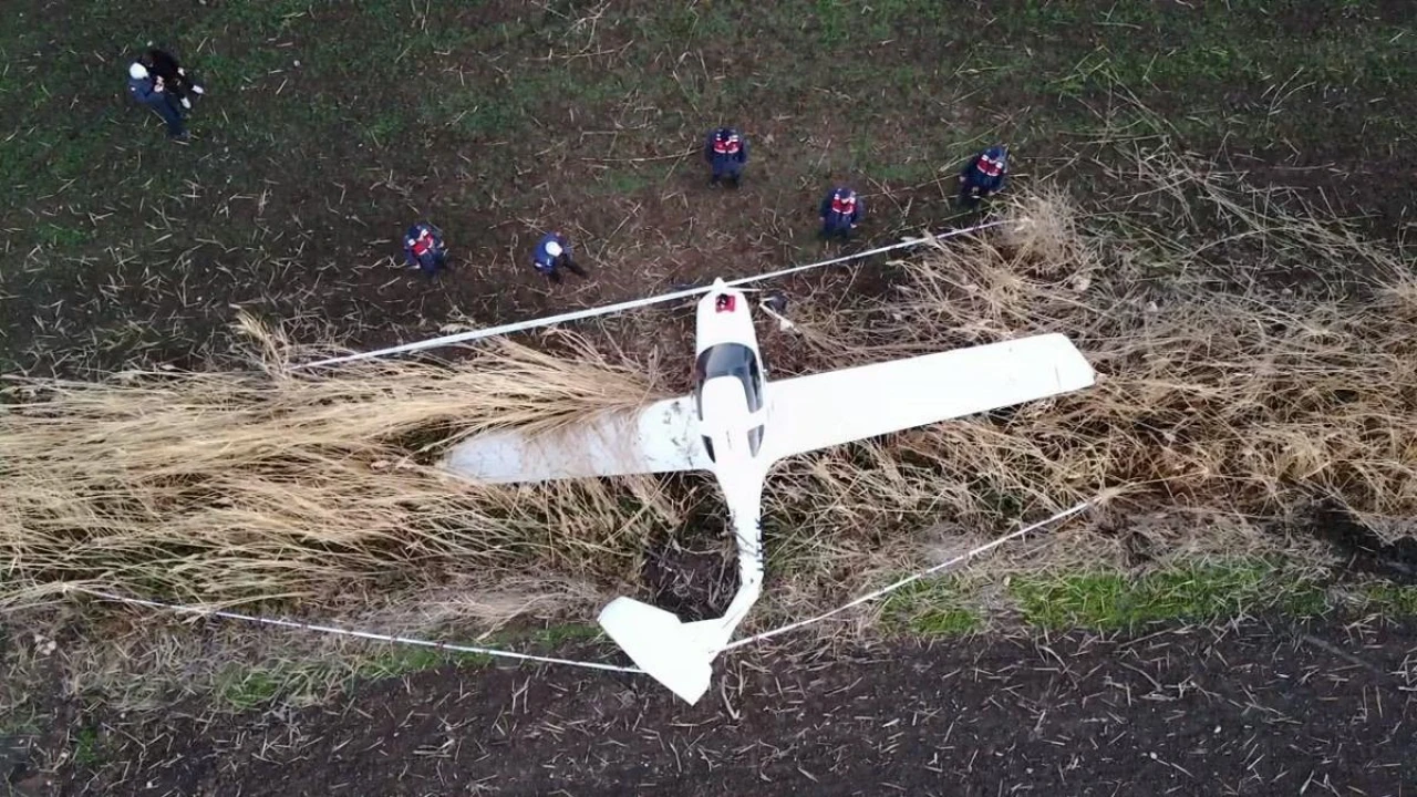 Bursa'nın Yenişehir ilçesinde tarlaya mecburi iniş yapan eğitim uçağının enkazı, dron ile görüntülendi.