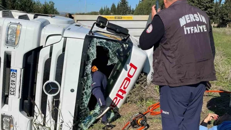 Mersin'in Tarsus ilçesinde meydana gelen kazada, kontrolden çıkarak devrilen tırın sürücüsü yaralandı.