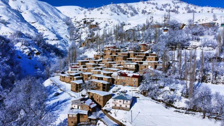 Bitlis’in Hizan ilçesindeki taş evlerden oluşan köyler, kış mevsimiyle birlikte kartpostallık manzaralar oluşturuyor.