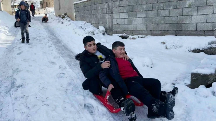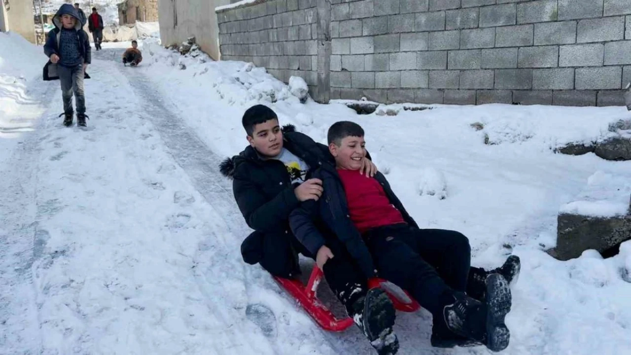 Tatvan’a bağlı Obuz köyünde kar yağışının ardından doğa beyaza büründü. Güneşin kendini gösterdiği köyde kızaklarını alan çocuklar kendilerini dışarı attı. Köydeki yokuş alanlarda bir araya gelen çocuklar tahta kızaklarıyla dakikalarca kaymanın keyfini yaşadı. Yorulmak bilmeyen çocukların eğlencesi güzel görüntüler oluştururken, zaman zaman kendi aralarında da yarıştılar.