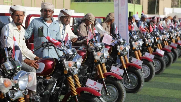 Motosikletlerin anahtar teslim töreni Yemen’in Hadramut ve Marib illerinde düzenlendi. 50’si nakliye, diğer yarısı yolcu taşımacılığında kullanılacak “tuk tuk” adındaki motosikletler hak sahiplerine teslim edildi.