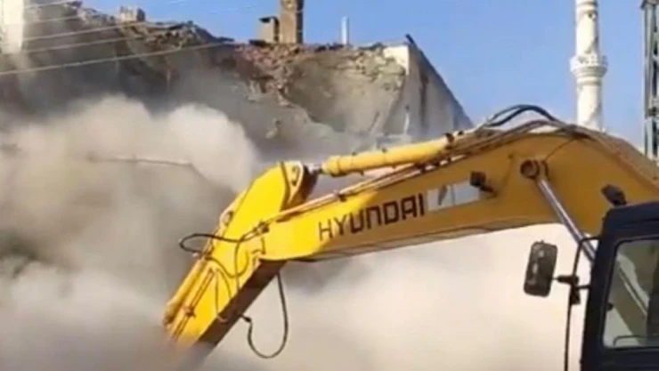 Kahramanmaraş'ta meydana gelen yıkıcı depremlerden etkilenen iller arasında bulunan Elazığ'da ağır hasarlı bina, iş makinesinin dokunuşuyla yerle bir oldu.