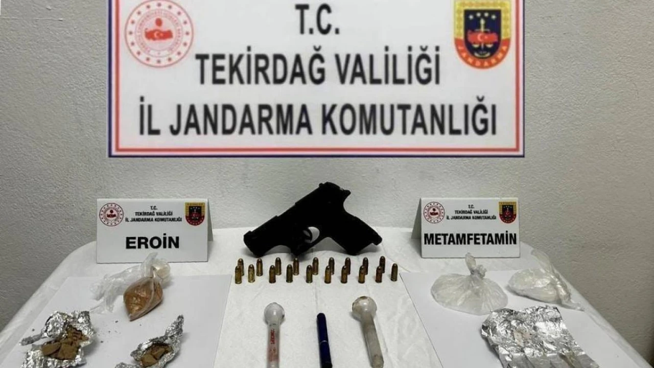 Çorlu Önerler Mahallesi’nde durdurulan araç içerisinde bulunan M.A., A.Ö., M.Ö. ve N.Ç. isimli şahısların yapılan aramasında 1 adet 7*65 mm çapında ruhsatsız tabanca, 1 adet şarjör, 19 adet tabanca fişeği, 50 gram metamfetamin, 32 gram eroin, 3 uyuşturucu madde kullanma aparatı ele geçirildi.