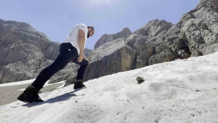 Temmuz ayında karlı yamaçları tırmandılar, buz gibi suya girerek serinlediler