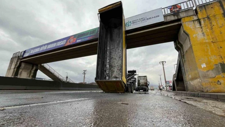 Kocaeli'nin Başiskele ilçesinde seyir halindeki bir tıraylerin açılan damperi üst geçite çarptı. Çarpmanın şiddetiyle tından kopan damper üst geçitte asılı kaldı.