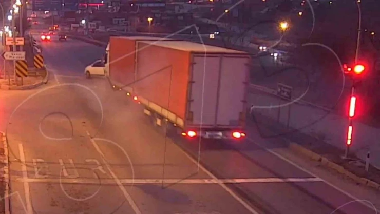Polis ekipleri tarafından kaza ile ilgili inceleme başlatılırken, o anlar ise güvenlik kamerasına yansıdı. Görüntülerde tırın kırmızı ışık sebebiyle bekleyen hafif ticari araca çarptığı görülüyor. Tır çarptığı aracı metrelerce sürüklüyor. Hafif ticari araç bariyerlere çarparak durabiliyor.