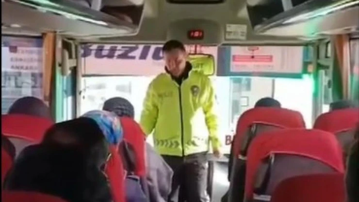 Ekipler yolcu otobüsü içerisinde ‘Sevdiklerinize sağlıklı bir şekilde kavuşmak istiyorsanız lütfen emniyet kemerinizi takın’ ifadelerini kullanarak yolcuları trafik kurallarına duyarlı olmaya davet ettiler.