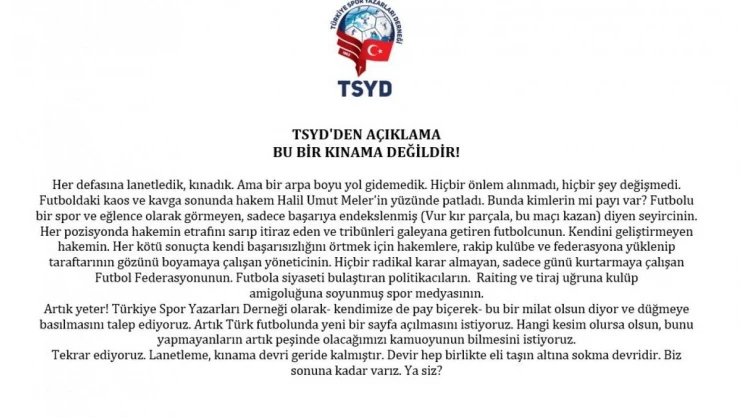 “Her defasına lanetledik, kınadık. Ama bir arpa boyu yol gidemedik. Hiçbir önlem alınmadı, hiçbir şey değişmedi. Futboldaki kaos ve kavga sonunda hakem Halil Umut Meler’in yüzünde patladı. Bunda kimlerin mi payı var? Futbolu bir spor ve eğlence olarak görmeyen, sadece başarıya endekslenmiş (Vur kır parçala, bu maçı kazan) diyen seyircinin. Her pozisyonda hakemin etrafını sarıp itiraz eden ve tribünleri galeyana getiren futbolcunun. Kendini geliştirmeyen hakemin. Her kötü sonuçta kendi başarısızlığını örtmek için hakemlere, rakip kulübe ve federasyona yüklenip taraftarının gözünü boyamaya çalışan yöneticinin. Hiçbir radikal karar almayan, sadece günü kurtarmaya çalışan Futbol Federasyonunun. Futbola siyaseti bulaştıran politikacıların. Raiting ve tiraj uğruna kulüp amigoluğuna soyunmuş spor medyasının. Artık yeter! Türkiye Spor Yazarları Derneği olarak kendimize de pay biçerek, bu bir milat olsun diyor ve düğmeye basılmasını talep ediyoruz. Artık Türk futbolunda yeni bir sayfa açılmasını istiyoruz. Hangi kesim olursa olsun, bunu yapmayanların artık peşinde olacağımızı kamuoyunun bilmesini istiyoruz. Tekrar ediyoruz. Lanetleme, kınama devri geride kalmıştır. Devir hep birlikte eli taşın altına sokma devridir. Biz sonuna kadar varız. Ya siz?”