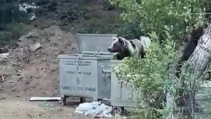 Tunceli Ovacık karayolu üzerinde, Munzur Vadisi Milli Parkı içerisinde yer alan Halbori Gözelerinde piknik yapan vatandaşlar, çöp konteynerini karıştıran ayıyı görünce şaşırdı. Vatandaşların piknik keyfine, davetsiz gelen ayı, konteyner çevresinde karnını doyurduktan sonra bölgeden ayrıldı.