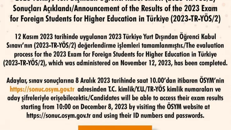 Ölçme, Seçme ve Yerleştirme Merkezi (ÖSYM) Başkanlığı, 2023 Türkiye Yurt Dışından Öğrenci Kabul Sınavı (2023-TR-YÖS/2) sonuçlarının açıklandığını bildirdi.