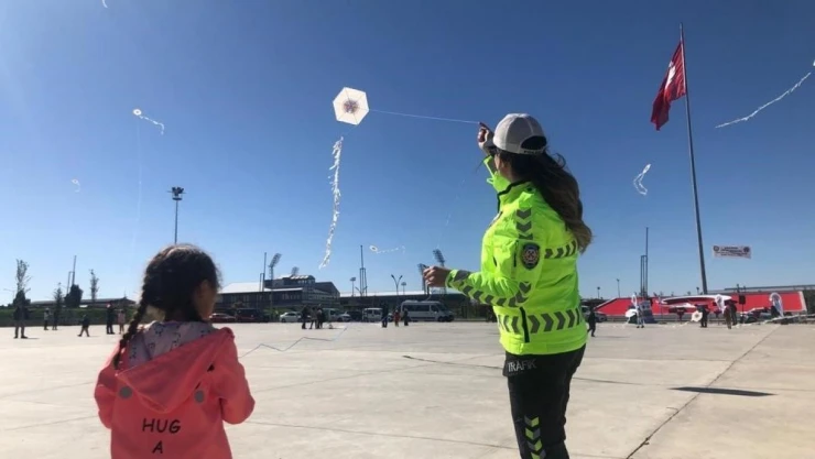 Erzurum'da 100 çocuk, polislerin organize ettiği bir etkinlikte uçurtmalarını gökyüzüne uçurdu.