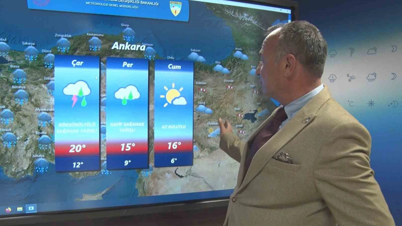 "Cuma’ya kadar olan günler boyunca Çarşamba, Perşembe hızlı bir sıcaklık düşüşü var. İstanbul’da sıcaklıklar 19 derecelere kadar düşüyor. Ankara’da Perşembe günü sıcaklıktan 16 dereceye kadar düşmesini bekliyoruz. Yine İzmir’de özellikle yarın, bugünkü kuvvetli yağışlarla birlikte sıcaklığın 18 dereceye kadar düşmesini beklemekteyiz. Bu düşüşlerle birlikte ülke genelinde sıcaklıklar mevsim normalleri altına düşecek. Bunun yanında gece sıcaklıklar biraz daha yüksek. Özellikle İstanbul’da 12-13 derece, İzmir’de 14 derece, Ankara’da 5-6 dereceler civarında. Kuvvetli yağışlarımız da var bu sistemin gelişiyle birlikte. Nerelerde? Salı günü için Marmara’nın batısı kıyıya gidiyor. Akşam saatlerine kadar kuvvetli yağışlar devam ediyor. Çarşamba günü Batı Karadeniz’in kıyı kesimlerinde, İç Ege’de, Güney Ege’de, Batı Akdeniz’e özellikle Antalya’nın doğu ilçelerinde kuvvetli ve yer yer çok kuvvetli yağışlar var. Doğu Akdeniz’de Adana, Osmaniye, Hatay’ın kıyı kesimleri, Kahramanmaraş’ın güney şeklindeki alanda da kuvvetli yağışların görülmesini bekliyoruz. Çarşamba günü Akdeniz’in iç kesimleri, İç Anadolu’nun güney ve doğusu, Doğu Anadolu’nun kuzey ve doğusu ve Doğu Karadeniz’in iç kesimlerinde lodos kuvvetli olarak esecek. Yer yer 80 km saate kadar çıkmasını bekliyoruz. Bu bölgedeki vatandaşlarımızın da bu kuvvetli rüzgara karşı tedbirli olmasını istemekteyiz. Hafta sonuna baktığımızda ise ülke genelinde yağış beklemiyoruz. Sıcaklıklar bir miktar artıyor. Ankara’da 16 dereceye kadar düşen sıcaklıkların hafta sonunda 19-20 derecelere çıkmasını bekliyoruz. İstanbul’da 21-22 dereceleri göreceğiz. İzmir’de de 24-25 derecelerin görülmesini tahmin etmekteyiz."