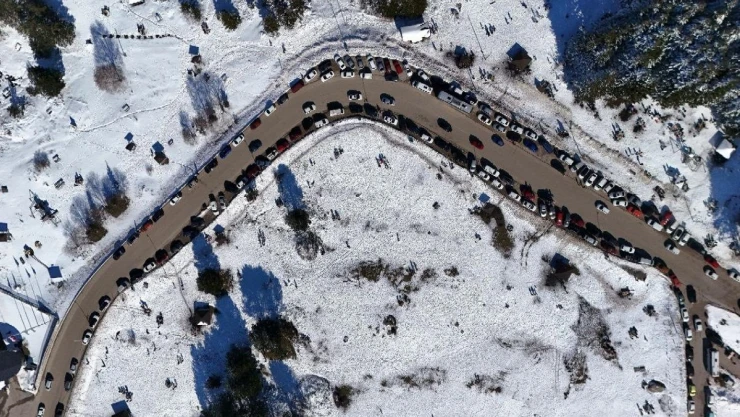 Araçların çift sıra park ettiği piknik alanları, havadan dron ile görüntülenirken, jandarma ekipleri ise sıkı denetimlerini sürdürdü. Araç ile gelmeyip, zirveye teleferik ile çıkmak isteyenler ise uzun kuyruklar oluşturdu.