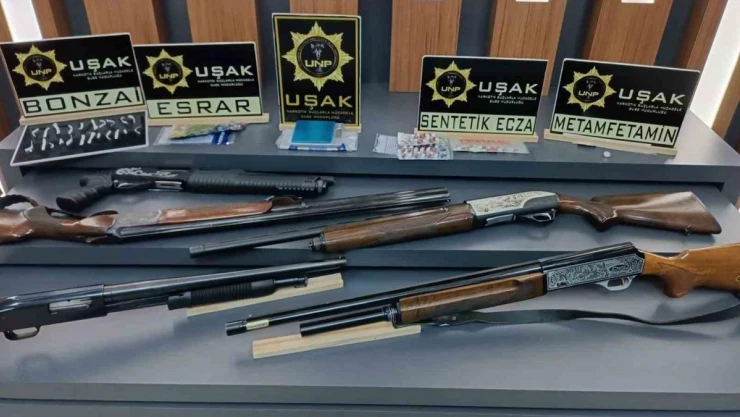 Uşak İl Emniyet Müdürlüğü’ne bağlı Narkotik Suçlarla Mücadele Şube Müdürlüğü ekipleri, uyuşturucu satıcılarına yönelik 11 adrese operasyon düzenledi. Operasyonda yapılan aramalar sonucu 11 bin 211 adet sentetik ecza, 74 adet farklı ebatlarda A4 kâğıda emdirilmiş bonzai, 17 gram metamfetamin, 4 adet ecstasy, 3 gram esrar, 1 adet hassas terzi, 1 adet tabanca, 5 adet tüfek ve 7 adet ele geçirildi. Yapılan operasyonda 10 kişi gözaltına alındı.