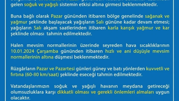 Uşak Valiliği tarafından yapılan uyarıda şu ifadelere yer verildi “Bölgemizin, 07.01.2024 Pazar gününden itibaren Balkanlar üzerinden gelen soğuk ve yağışlı sistemin etkisi altına girmesi beklenmektedir. Buna bağlı olarak Pazar gününden itibaren bölge genelinde sağanak ve yağmur seklinde başlayacak yağışların Salı gününe kadar devam etmesi; yağışların Salı aksam saatlerinden itibaren karla karışık yağmur ve kar seklinde olması tahmin edilmektedir. Halen mevsim normallerinin zerinde seyreden hava sıcaklıklarının 10.01.2024 Çarşamba gününden itibaren hızlı ve ani düşüşle mevsim normallerinin altına düşmesi beklenmektedir. Rüzgârların Pazar ve Pazartesi günleri güney ve bat yönlerden kuvvetli ve fırtına (60-80 km/saat) seklinde eseceği tahmin edilmektedir. Vatandaşlarımızın soğuk ve yağışlı havanın meydana getireceği olumsuzluklara karşı dikkatli olması ve gerekli önlemleri almaları uygun olacaktır.” ifadeleri kullanıldı.
