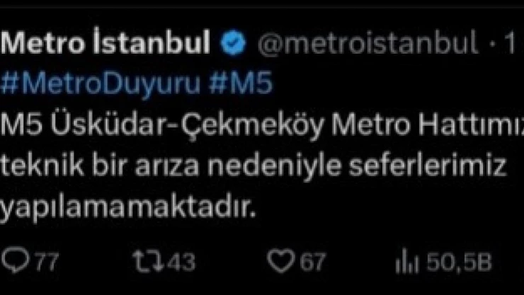 "M5 Üsküdar-Çekmeköy Metro Hattımızda teknik bir arıza nedeniyle seferlerimiz yapılamamaktadır" denildi.