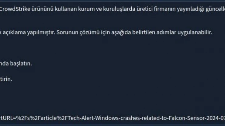 Dünya genelinde birçok kurumun ve firmanın etkilendiği internet sorunu ve siber aksaklık için çalışma yürüten USOM, sorunun siber saldırı kaynaklı olmadığını bildirdi. Konuya ilişkin yapılan açıklamada, “Windows işletim sistemi kullanan cihazlarda global çapta meydana gelen kesintiye ilişkin yapılan inceleme neticesinde yaşanan aksaklığın siber saldırı kaynaklı olmadığı tespiti yapılmıştır. Söz konusu kesintinin CrowdStrike ürününü kullanan kurum ve kuruluşlarda meydana geldiği tespit edilmekle birlikte, çözüm önerileri SİP üzerinden tüm SOME’lerimiz ile paylaşılmıştır. Ülkemizin siber sınırlarını korumak için yerli ve milli ürünlerimizle 7 gün 24 saat aralıksız çalışmaya devam ediyoruz” denildi.