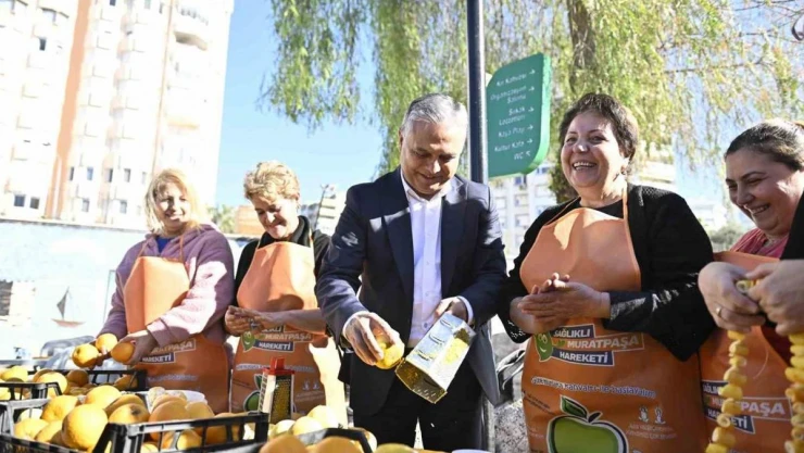 Muratpaşa Belediye Başkanı Ümit Uysal, Antalya'ya yerleşen depremzede kadınlarla birlikte yürütülen Dramayla Yeni Hayata Uyum Sağla projesi kapsamında düzenlenen panayırda kadınlarla turunçları rendeledi, kabuklarını ipe dizdi ve turunç reçeli hazırladı.