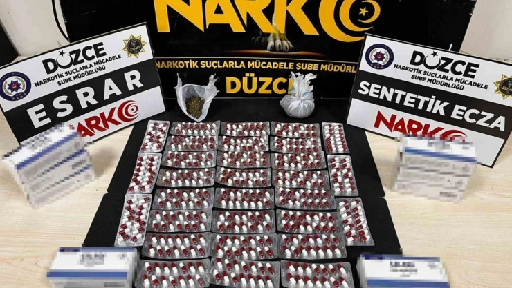 DÜZCE (İHA) – Düzce'de polis ekipleri tarafından durdurulan araçta 448 adet uyuşturucu ve uyarıcı hap ve esrar ele geçirildi. Gözaltına alınan 2 kişi tutuklandı.