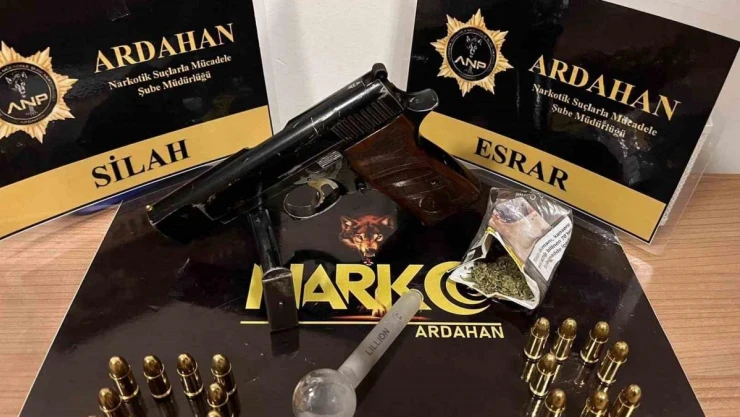 Ardahan il Emniyet Müdürlüğü Narkotik Suçlarla Mücadele Şubesi ekiplerince kentte uyuşturucu kullanımı ve ticaretini önlemeye yönelik operasyon düzenlendi. Ekipler, C.U, E.H, E.Ç. ve M.Y.K’nin üzerinde yaptıkları aramada, bir miktar esrar ve bir ruhsatsız tabanca ile 30 mermi ele geçirdi.
