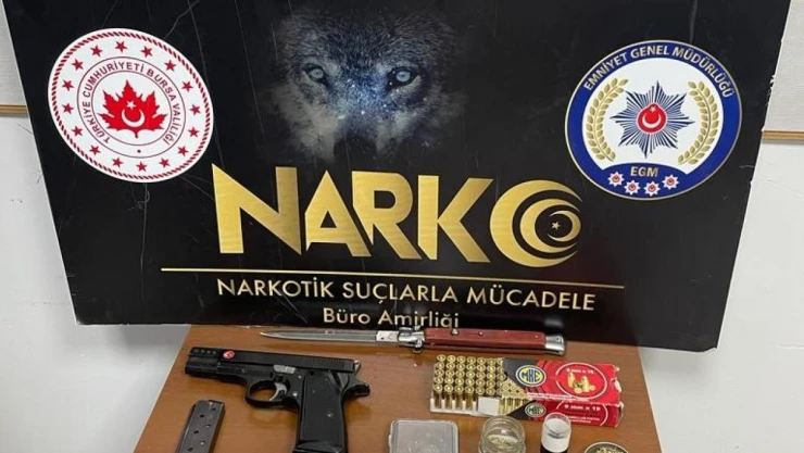 Gemlik Cumhuriyet Başsavcılığı talimatıyla Gemlik İlçe Emniyet Müdürlüğü Narkotik Suçlarla Büro Amirliği ekipleri harekete geçti. Gemlik ilçesi Umurbey Mahallesindeki A.P.’nin (43) evinin önünde bulunan araçta yapılan aramada, ruhsatsız tabanca, hassas terazi, sustalı bıçak, 6,20 gram sentetik kababinoid, 12,44 gram metanfetamin ele geçirildi.