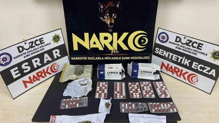 Düzce Cumhuriyet Başsavcılığı koordinesinde Narkotik Suçlarla Mücadele Müdürlüğü tarafından sokak çalışmalarında S.Ç. isimli şüpheli yakalandı. Teknik ve fiziki takip sonucunda tespit edilmiş olup yapılan aramalarda ise şahıstan 70 gram esrar maddesi ile 102 adet sentetik ecza maddesi ele geçirildi. Şüphelinin uyuşturucu sattığı 2 kişiye uyuşturucu madde bulundurmak ve kullanmak suçundan adli işlem yapıldı. S.Ç. ise uyuşturucu madde ticareti yapmak suçundan tutuklandı.
