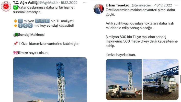 Ağrı İl Özel İdaresi de, 16.12.2022 tarihinde web sayfasında sondaj makinesinin alındığını müjdeleyen bir paylaşımda bulundu.