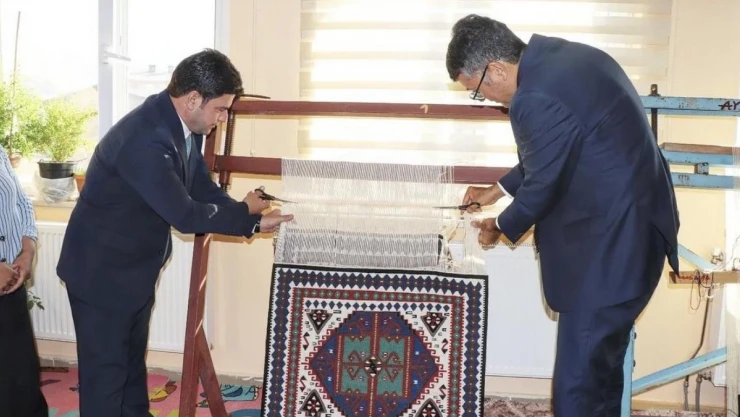 Vali Çelik, kadın kursiyerlerin yerine kilim kesti