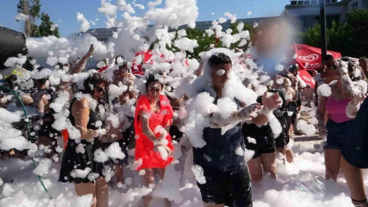 Yaz tatilini Van’da geçiren İranlılar, Akdeniz sahillerini aratmayan köpük partisiyle serinliyor.