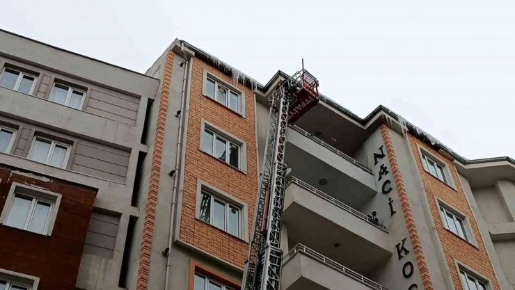Van'da soğuk havanın etkisiyle binaların çatılarında oluşan ve boyu yer yer 2 metreyi bulan buz sarkıtları, itfaiye ekipleri tarafından temizleniyor.