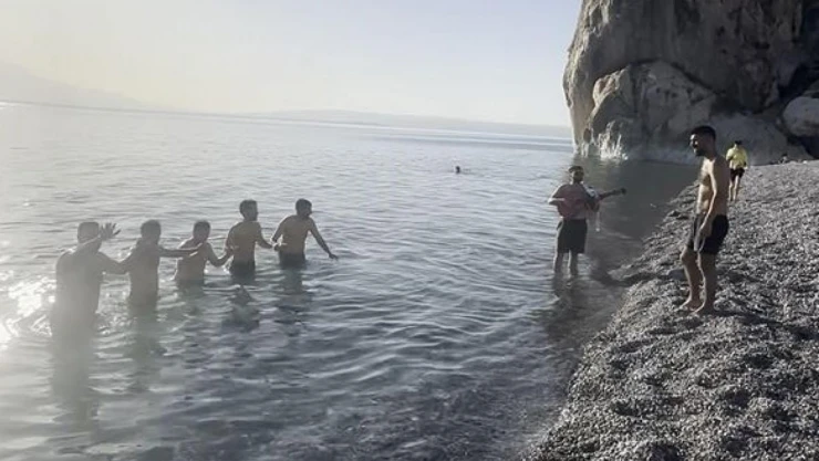 Van’da Kurban Bayramı tatilini değerlendiren bir grup arkadaş, sahilinde piknik yaptıkları Van Gölü’ne girerek hem serinlediler hem de halay çekerek eğlendiler.