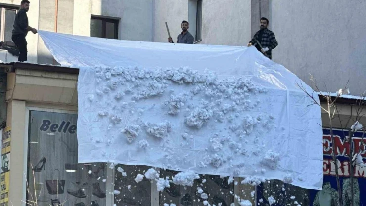 Vatandaşlar çatıdaki kar kütlelerini brandayla indirdi