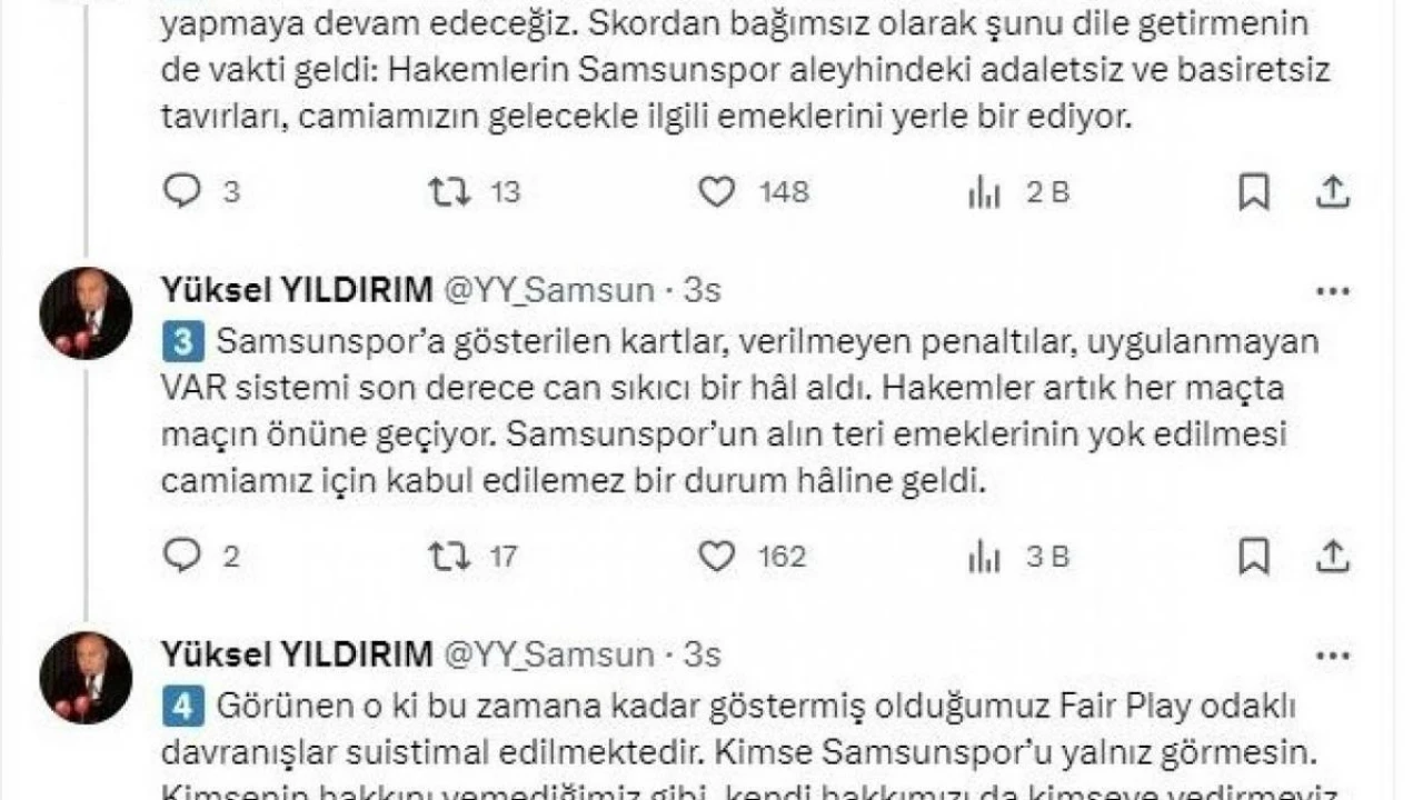 SAMSUN (İHA) – Y. Samsunspor ve Başkan Yüksel Yıldırım, yazılı açıklama ile hakem hatalarına tepki göstererek, adalet vurgusu yaptı.
