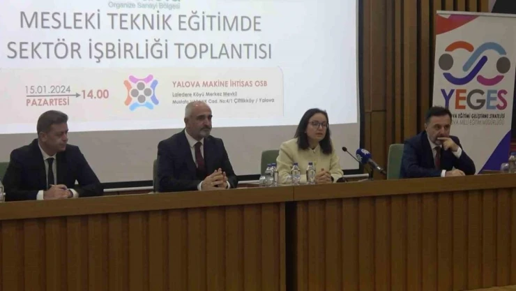 Mesleki ve Teknik Eğitimde Sektör İşbirliği Toplantısı Yalova Makine OSB Konferans Salonu’nda gerçekleştirildi. Vali Hülya Kaya başkanlığında yapılan toplantıda Milli Eğitim Bakanlığı Mesleki ve Teknik Eğitim Genel Müdürü Ali Karagöz, İl Milli Eğitim Müdürü Halil İbrahim Akmeşe ve Yalova Makine OSB Yönetim Kurulu Başkanı Direnç Özdemir’in yanı sıra sektör temsilcileri hazır bulundu.