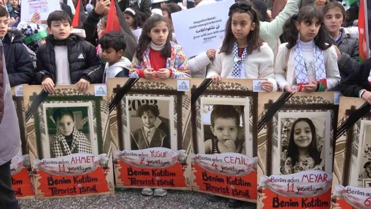 Yalova’da 23 Aralık Dünya Şehit Çocuklar Günü nedeniyle düzenlenen etkinlikte çocuklar İsrail’i protesto etti. Filistinli akranları için yürüyen çocuklar, Yalova’dan dünyaya 3 dilde okunan bildiriyle seslendi.