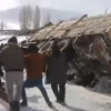 Van’ın Gürpınar ilçesinde yan yatan saman yüklü kamyon, vatandaşlar tarafından ip bağlanarak kaldırıldı.