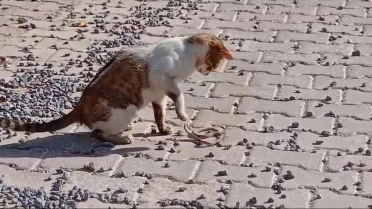 Elazığ’ın Keban ilçesinde kedi, yolun ortasında gördüğü yılanla fare gibi oynadıktan sonra afiyetle yedi.