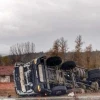 Devrilen kamyonun kaldırılması için çalışma başlatıldı.