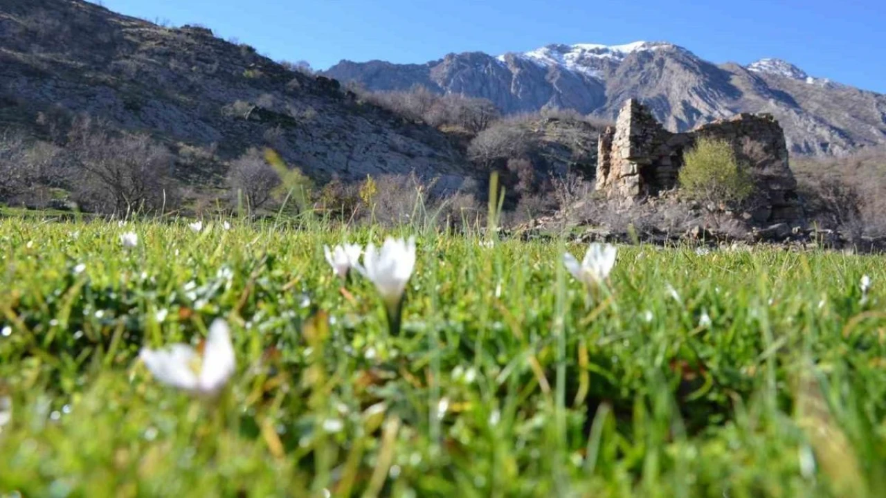 Şırnak’ın Beytüşşebap ilçesinde yüksek kesimler kar altında kalırken, alçak bölgelerde ise çiçekler açtı.