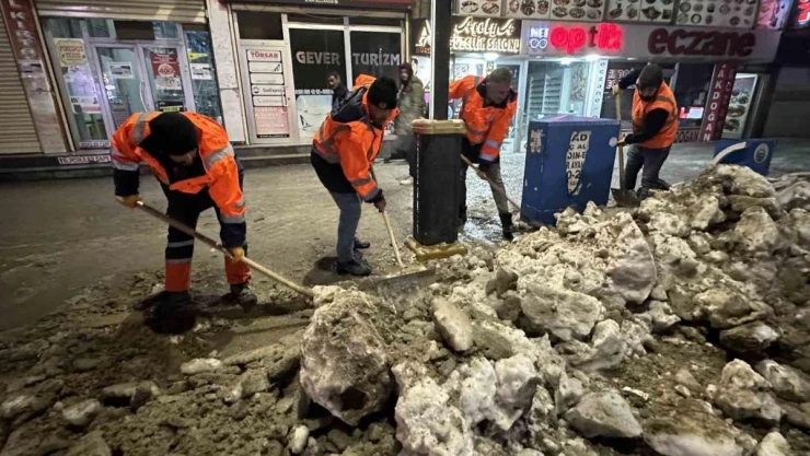 İlçenin dört bir yanında karla mücadele çalışması yapan ekipler, akşam saatlerinde de ilçenin en işlek caddelerinde birinken karları temizlemeye başladı. Ziraat Bankası önünde başlayan ekipler, Şemdinli yolunun ilçe çıkışına kadar sağlı sollu kar ve buz kütlelerini temizledi. Araçların giremediği yerlere ise ekipler ellerine aldığı küreklerle temizledi.