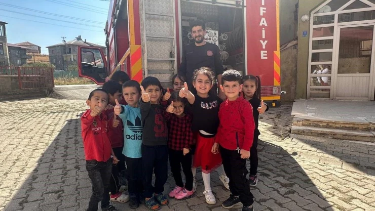 Anaokulu öğrencilerine itfaiye personeli tarafından yangın, yangın çeşitleri ve yangına karşı alınacak önlemler olmak üzere yangın konusunda gerekli tüm bilgiler verilirken, itfaiye araçları da tanıtıldı.